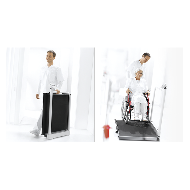 La balance professionnelle Modulest offre un large espace pour peser les personnes en chaise roulante. Avec ses roulettes et poignées intégrées, le pèse-personne se transporte facilement. Il peut être utilisé en autonomie avec une batterie rechargeable (fournie).