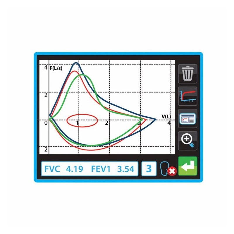• 40 paramètres disponibles (dont VC, FVC, FEV1, FEV1R, PEF).