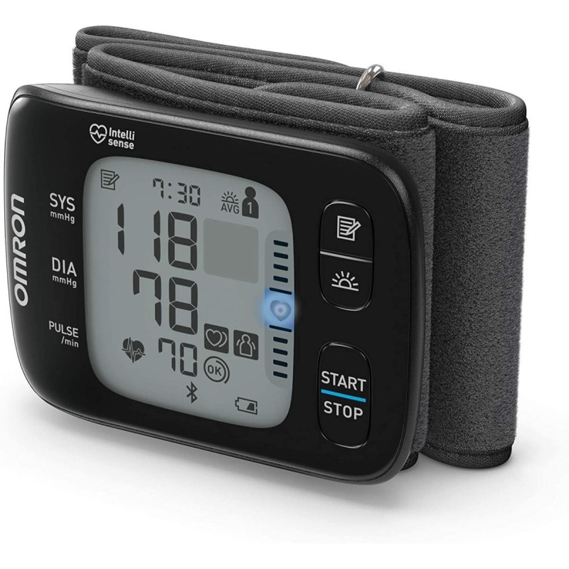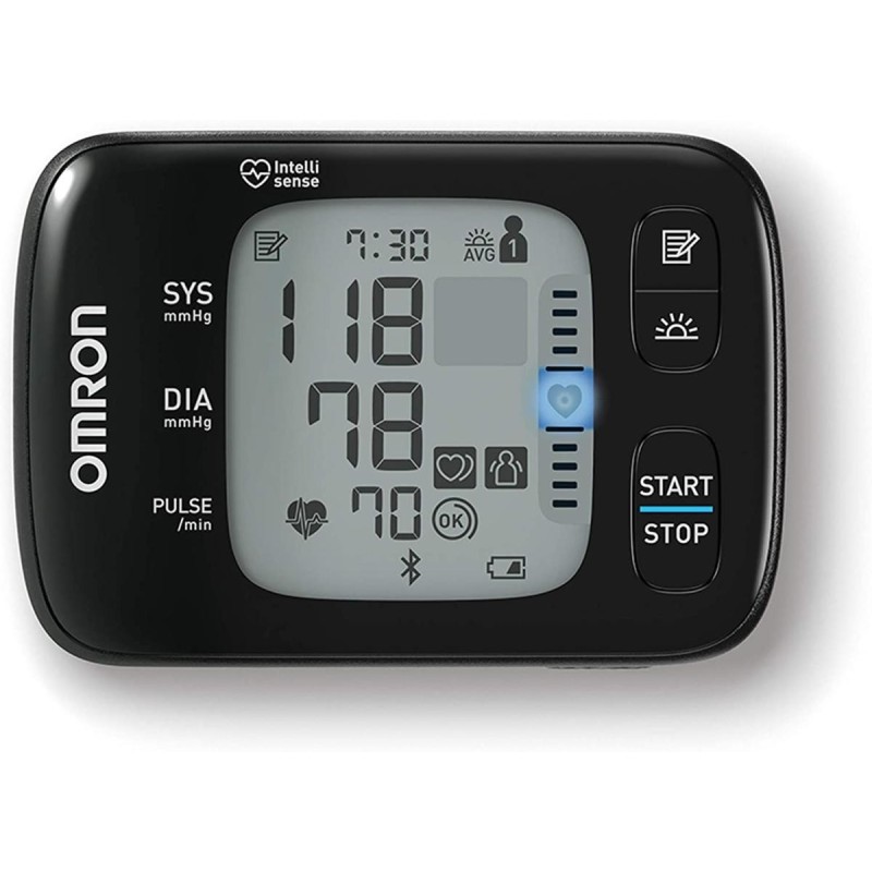 Le tensiomètre RS7 est aussi extrêmement facile à utiliser et à prendre en main. Il permet de mesurer la pression artérielle systolique et diastolique, ainsi que la fréquence cardiaque. Il est équipé d'un détecteur d'irrégularité cardiaque et d'hypertension. Pour garantir une précision maximale, il dispose d'un détecteur de mouvements du corps et d'un capteur de positionnement qui aide à déterminer si le tensiomètre est à la bonne hauteur vis-à-vis du cœur (indicateur LED bleu).