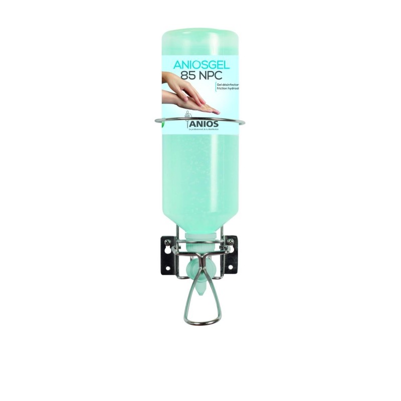 Support mural pour savons/gels Anios, adapté flacon 1L Airless. Équipé commande au coude pour respecter hygiène (activation sans mains).