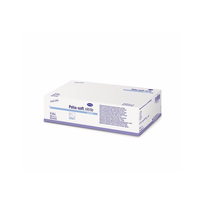 Le Peha-Soft® Nitrile Guard est un gant d'examen à usage unique, non poudré et non stérile (l'absence de poudre évite les problèmes d'allergies et d'irritation). Il se distingue des autres gants par ses manchettes longues (290 mm) à bord roulé, offrant une protection renforcée contre les projections, par exemple en laboratoire, ou lors de désinfection de surfaces ou de manipulations particulières.