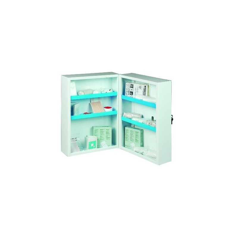 Armoire métal murale compartiments portes gain place rangement soins courants travail/scolaire/infirmerie/salle bain/bureau. Fermeture clé sécurisée, complétable médicaments/matériel secours.