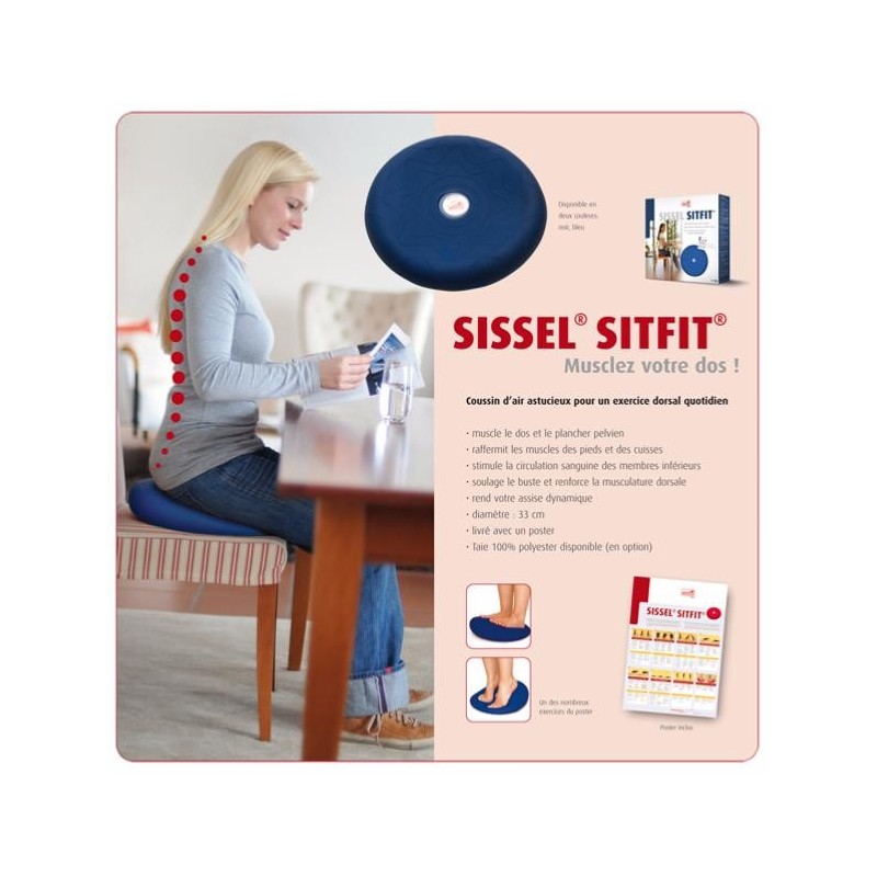 Le Sitfit rond, de couleur rouge, est peu encombrant et gonflable. Il peut également être utilisé comme plateau d’équilibre sur un ou deux pieds pour améliorer l’équilibre. Placé sur une chaise ou sous les pieds, il procure un effet relaxant et améliore la concentration, y compris chez l’enfant.