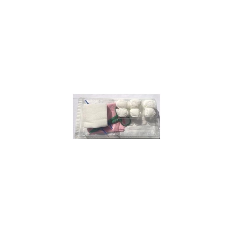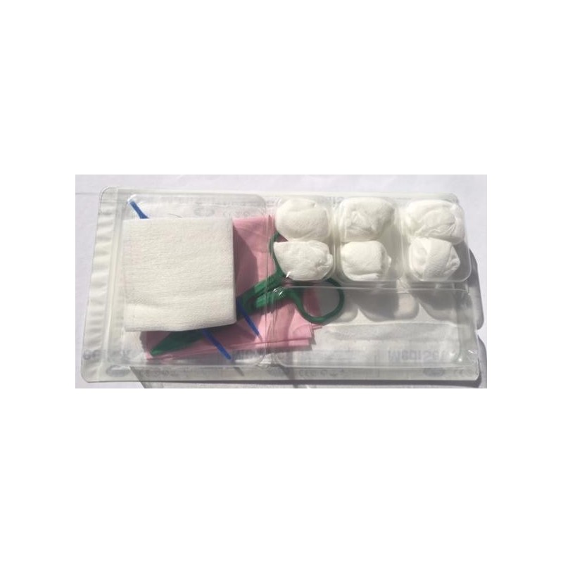 Le Set de pansement N° 1, Stérile, comprend : 5 Compresses nontissé, 1 Pince anatomique, 6 Tampons nontissé, 1 Gant 3 doigts ambidextre, 1 Pince Kocher.