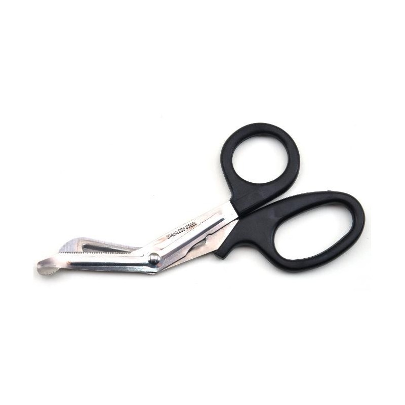 Manche plastique, partie coupante acier inoxydable. Ciseaux de secours pour toutes situations : couper vêtements, fils, pansements, bandages.