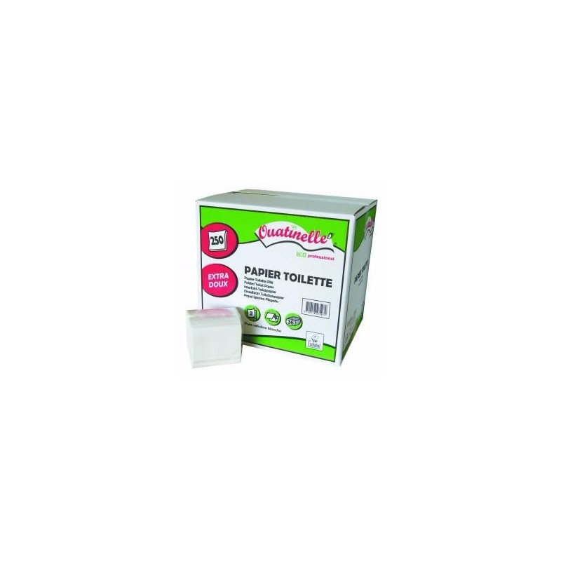 Papier toilette 100% pure ouate de cellulose blanche, 2 épaisseurs de qualité extra, paquet de 250 feuilles micro-texturisées.