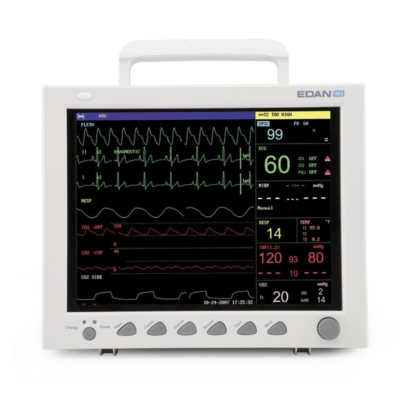 L'EDAN iM8 est un moniteur multi-paramétrique de signes vitaux portable, permettant de mesurer les paramètres des signes vitaux essentiels : la fréquence cardiaque (ECG 5 dérivations), le rythme respiratoire (RESP), la saturation en oxygène du sang (SpO2), la pression artérielle non invasive (NIBP), la température (double mesure).