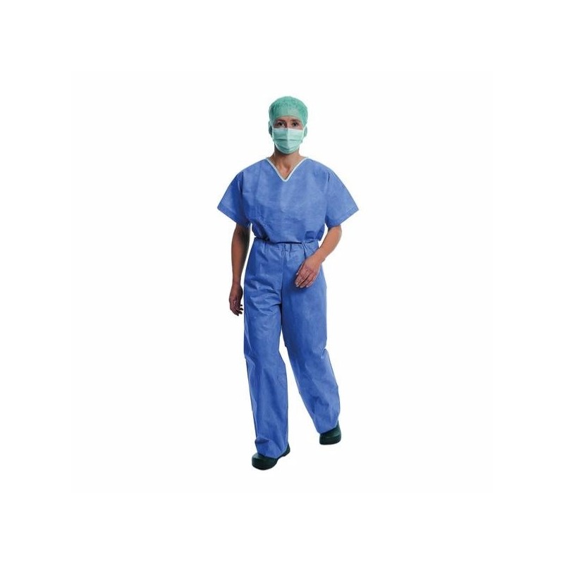 Le Foliodress Suit est une tenue de bloc, en non tissé, destinée à un usage unique médical. C'est un pyjama de protection médicale, constitué d'une tunique et d'un pantalon. La tunique est à manches courtes, avec une encolure en V, avec 2 poches inférieures. Le pantalon dispose d'un lien à nouer à la taille, très pratiques et très confortables !